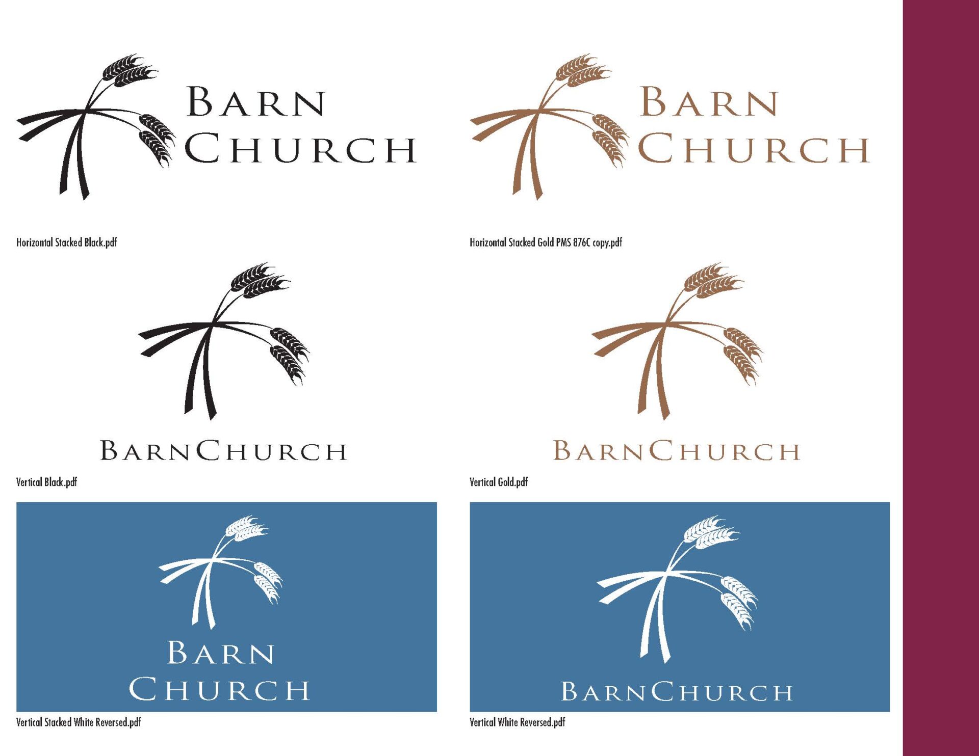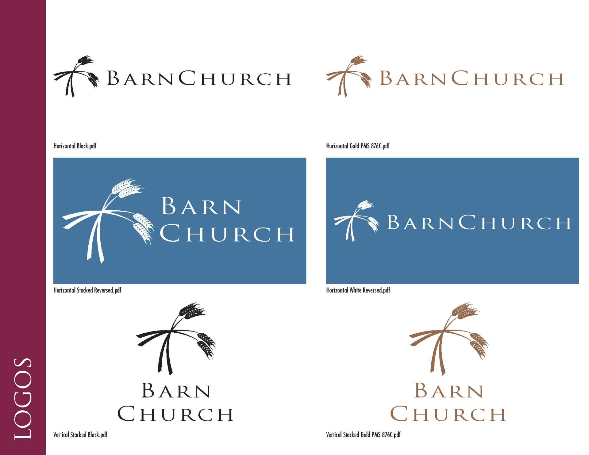 Barn Church Brand Book Logo Configuration. If a logo doesn't work in flat black on white, the logo simply does not work. In my experience, logos will be printed, projected, embroidered, and even dyed into cloth. Most of those methods require a single, flat color. Furthermore, logos must be handed off to the client in all useable configurations to best fill available space, and in the approved brand colors. All of this must be presented in a coherent package usable by church employees and production professionals, including saving each logo variation in every format they might need in the future.