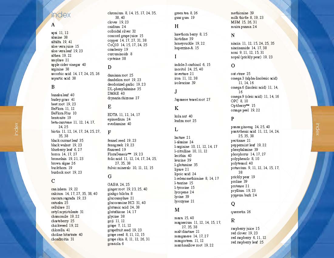 Using the power of pro-level layout software, I marked each ingredient in every supplement facts panel in the Health section, allowing the software to create a dynamic and comprehensive index of ingredients used in the company’s nutritional supplements line.