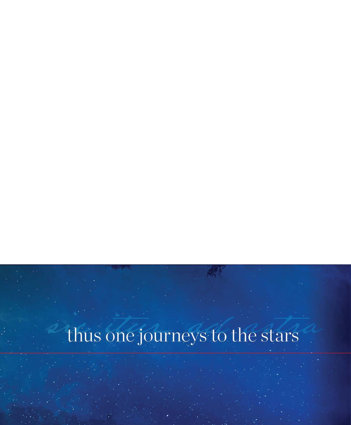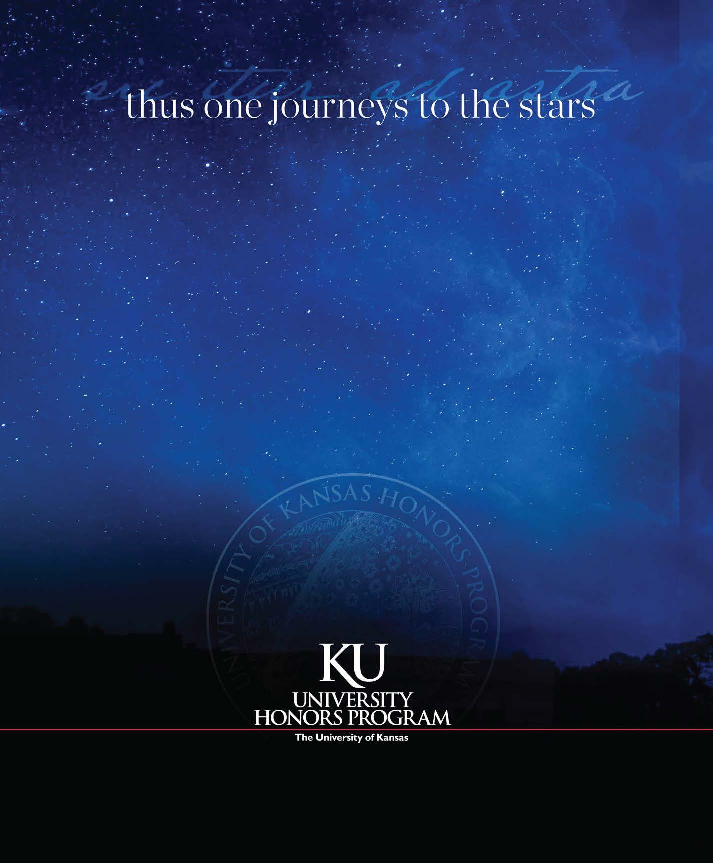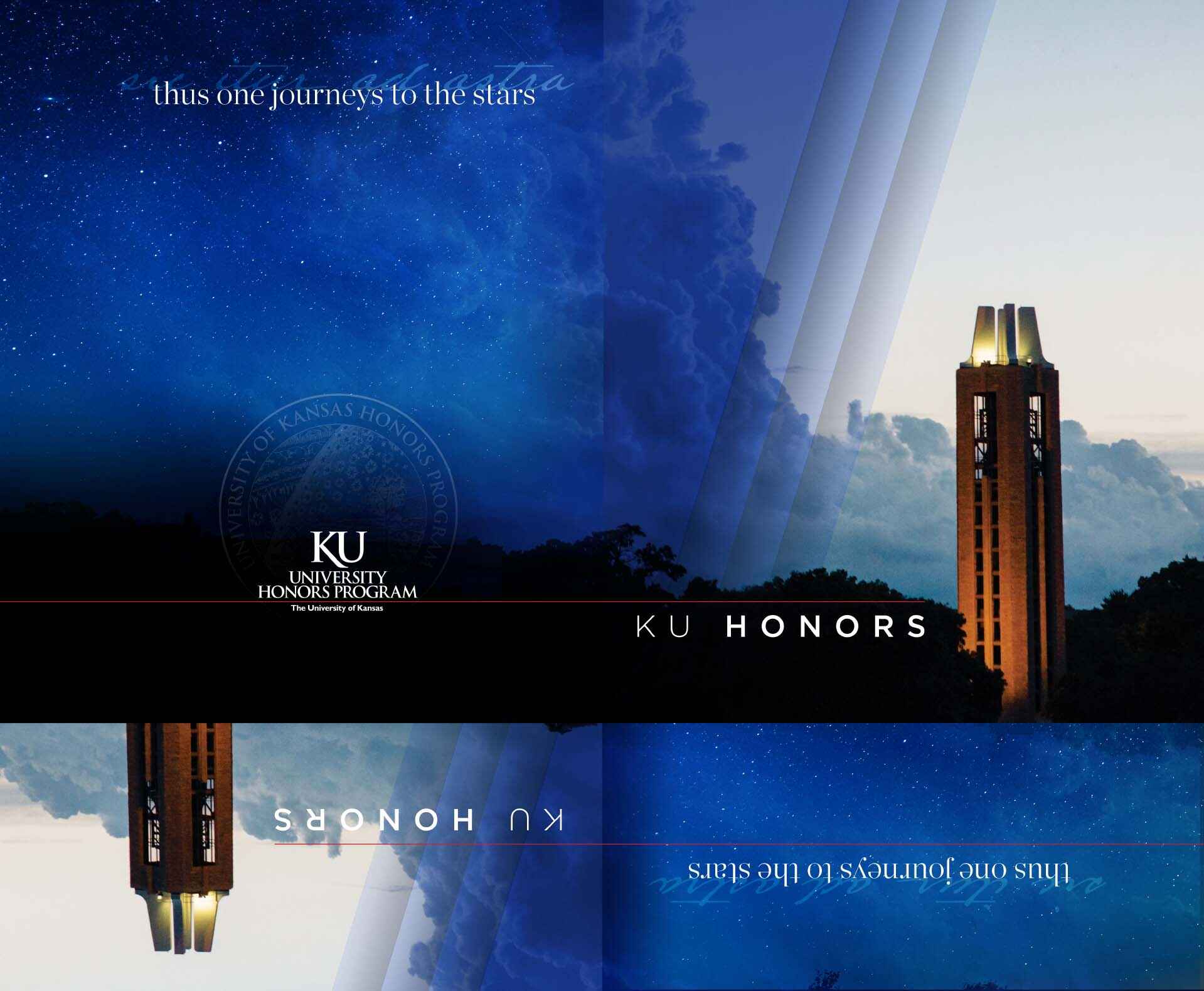 I employed KU’s official color palette of rich dark blue, crimson red, and vibrant yellow. The program’s motto “sic itur ad astra,” “thus one journeys to the stars” received a type treatment that became a staple of the design language.Â