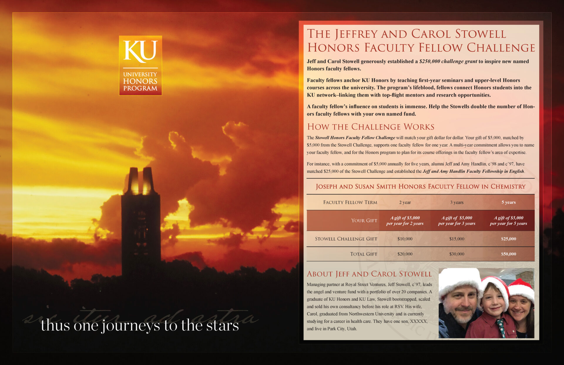 Development and fundraising are vital functions of any university program. This piece announced a new funded faculty fellowship in the Honors Program and a donation matching promotion. Again, captivating photography takes pride of place, literally framed by the design language I developed for the program. The brochure was mailed to a list of donors for whom images of the KU campus would hold particular meaning and nostalgia.